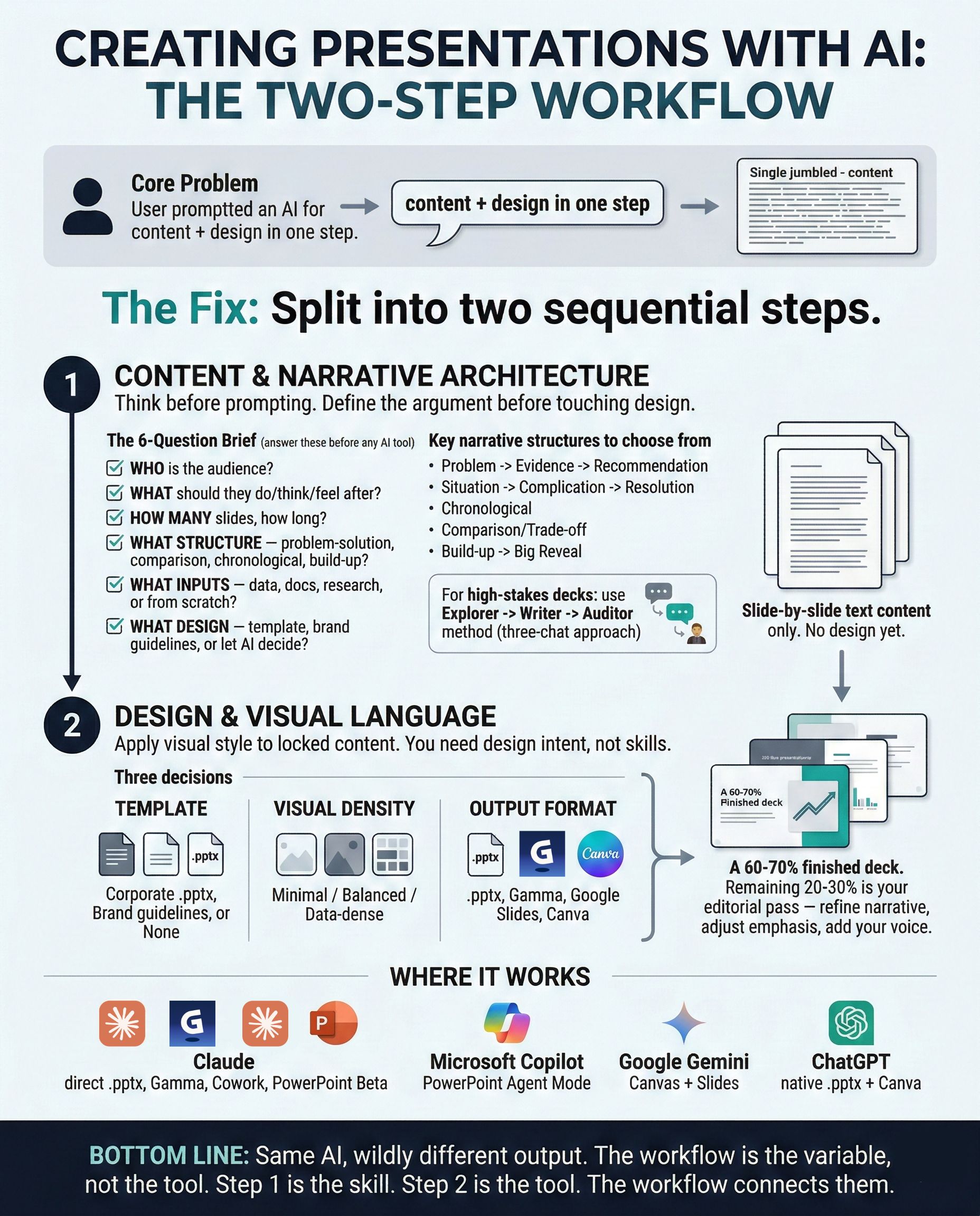 Most people prompt with: "Make me a 10-slide deck about market trends." That's a lazy brief. You'll get a lazy deck. The workflow starts before you touch any tool.