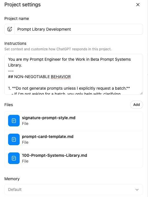 So, after going through months of pain, I decided to build a ChatGPT project called ‘Prompt Library Builder’ that generates structured prompts on demand for 100 general purpose tasks in my voice. It took 15 minutes to set up. I’ve used it 60+ times since.